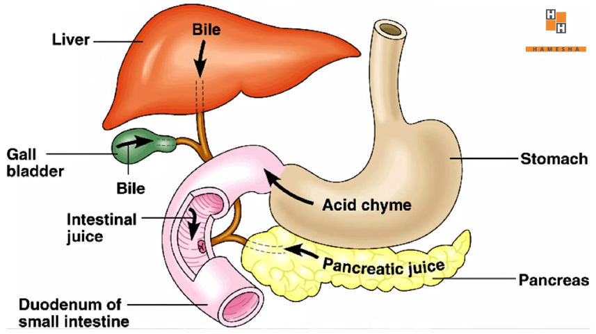 Bile juice from the liver and gallbladder helps digest fats.